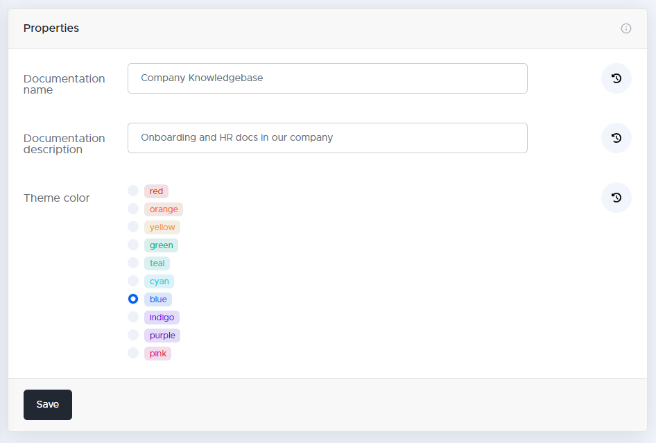 By choosing a specific color, the shared documentation presented to end users will reflect a unique and stylish appearance that enhances your documentation's overall look and feel.